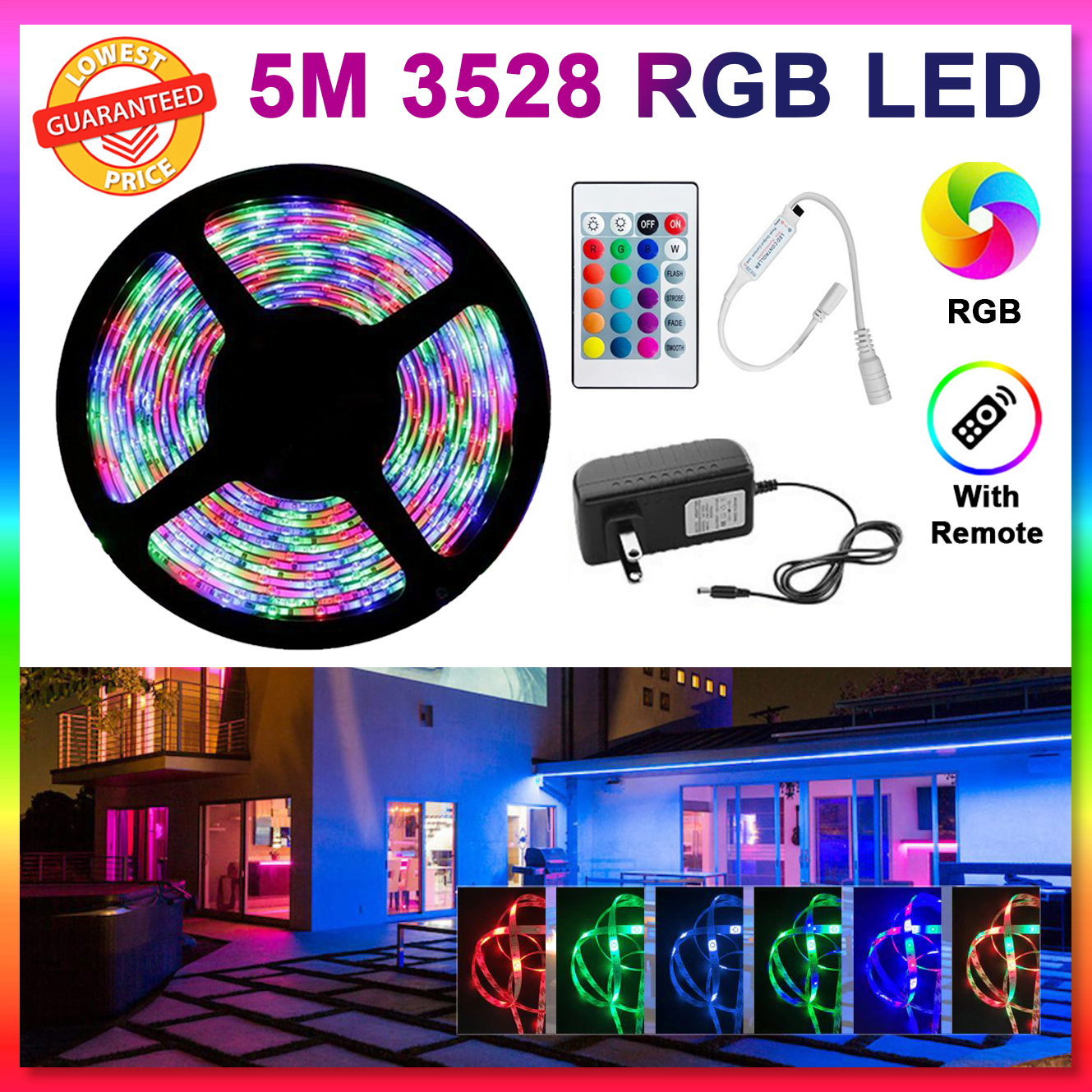 - Kit tout en un : ce kit de bandes lumineuses LED comprend 1 bande RVB 150 SMD 5050 5 m non étanche, 1 télécommande IR 44 touches, et 1 adaptateur d’alimentation 2 A 12 V (prise US), vous n’avez pas besoin de dépenser plus de temps et d’argent pour acheter d’autres accessoires.