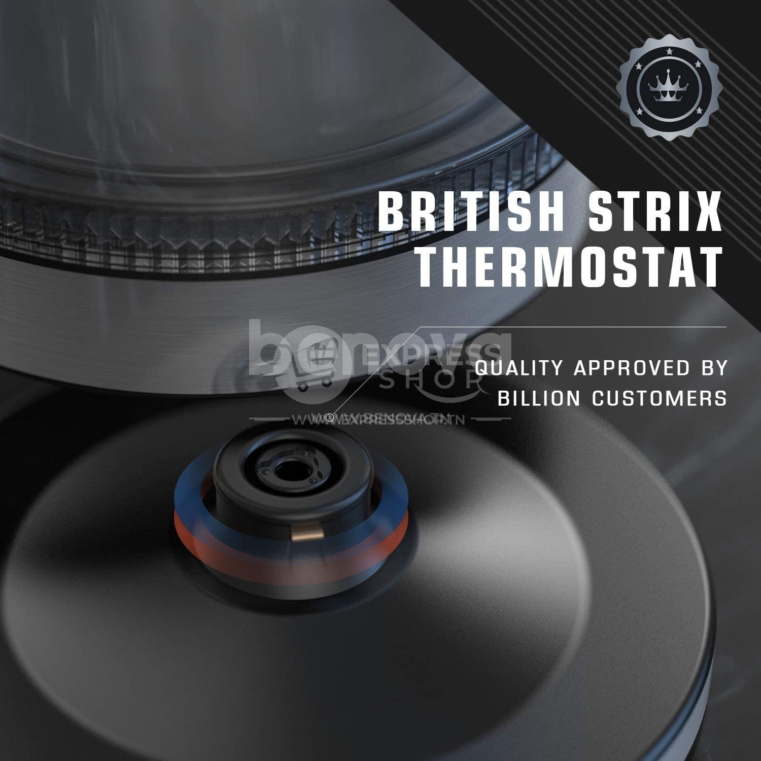 Bouilloire électrique sûre et précise équipée d’un thermostat britannique Strix. Fournir des performances sûres et stables. L’utilisation de véritables commandes Strix prolonge la durée de vie de votre produit et élimine les risques associés à l’utilisation de composants de mauvaise qualité.