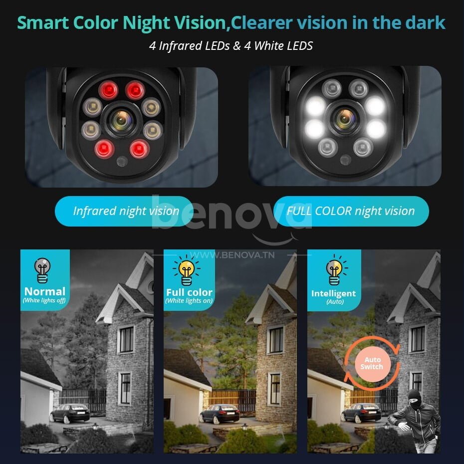 - Vision nocturne couleur et infrarouge: construit avec projecteur, enregistrer en couleur toute la journée.