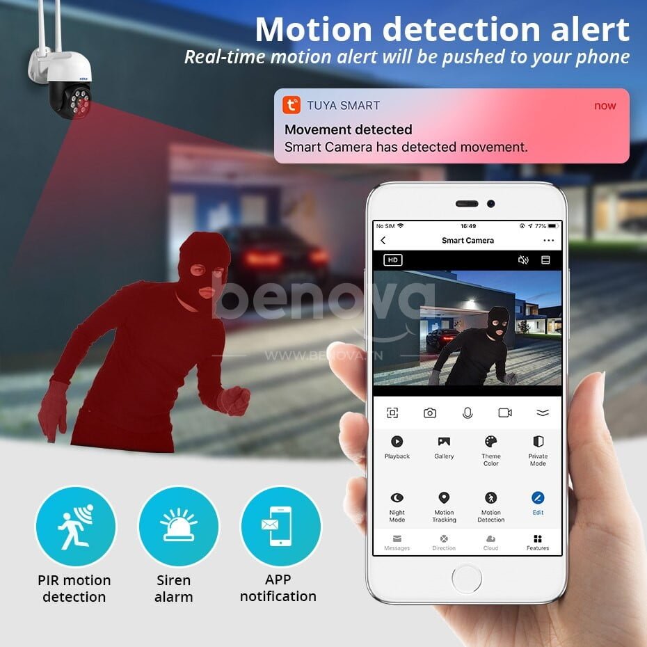 Cette caméra de Surveillance extérieure wifi a une résolution de1080P (Plein-HD), et fournit des images Ultra HD jour et nuit, capturant tous les détails. Cette caméra extérieure WiFi PTZ est idéale pour les espaces ouverts tels que les portes d’entrée, les parking, les garage.