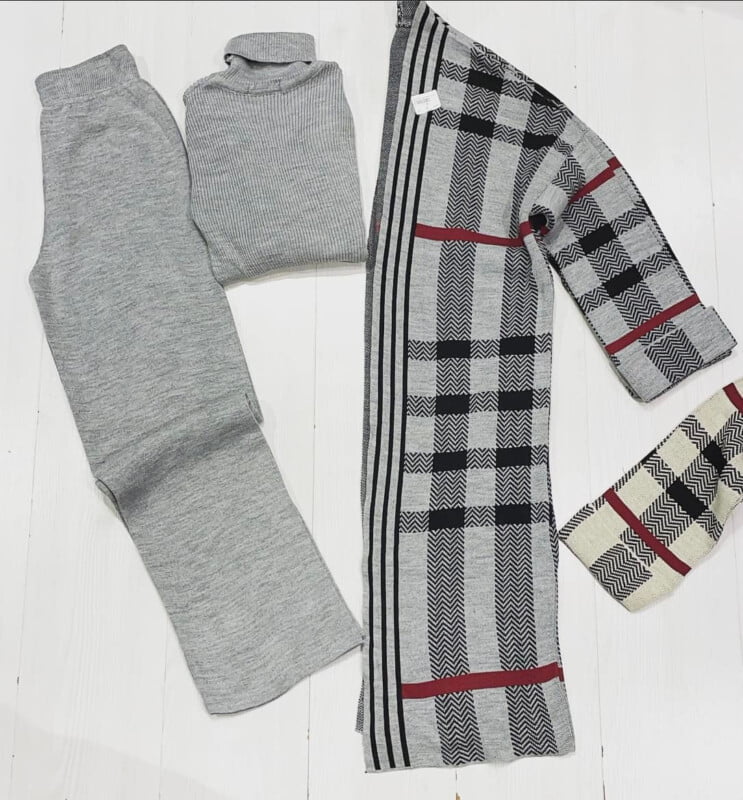 - Le produit est pour l’hiver et il est en tricot. Il se compose de 3 parties, jellet, tunique et pantalon. Le motif de la tunique est ligne, le pantalon est modèle droit. Le pantalon du produit n’a pas de poches et la taille est avec des poignets épais. La tunique est un modèle de costume en tricot avec un dos long, un devant court et un demi-cou.