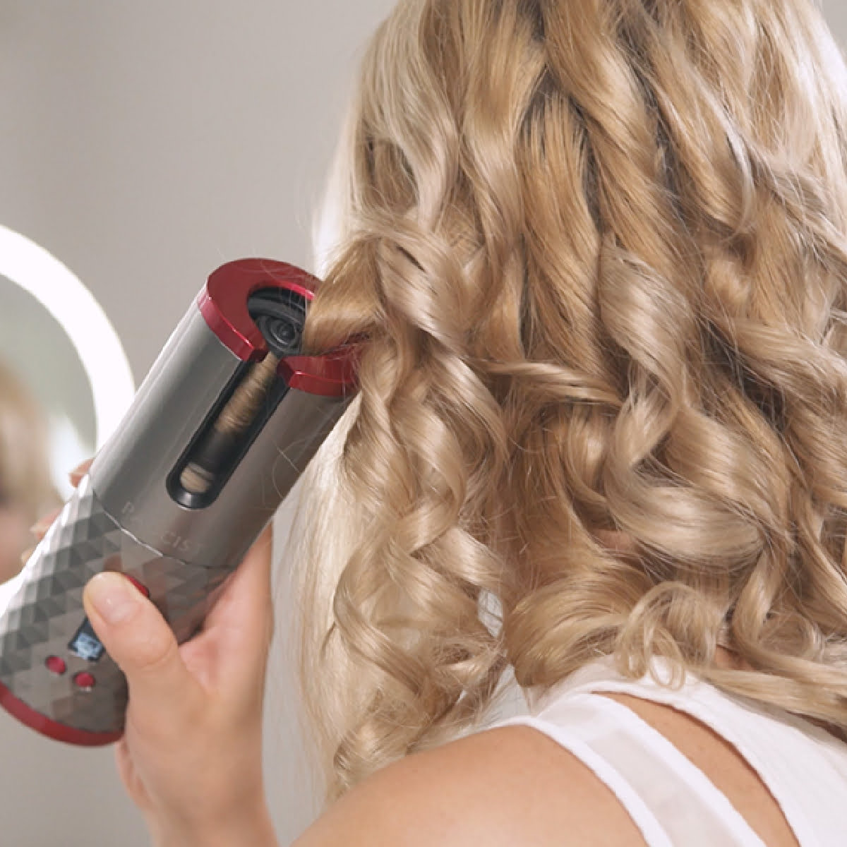 - Insérez les cheveux dans la chambre de bouclage, appuyez sur le bouton et maintenez-le enfoncé pour commencer à boucler.